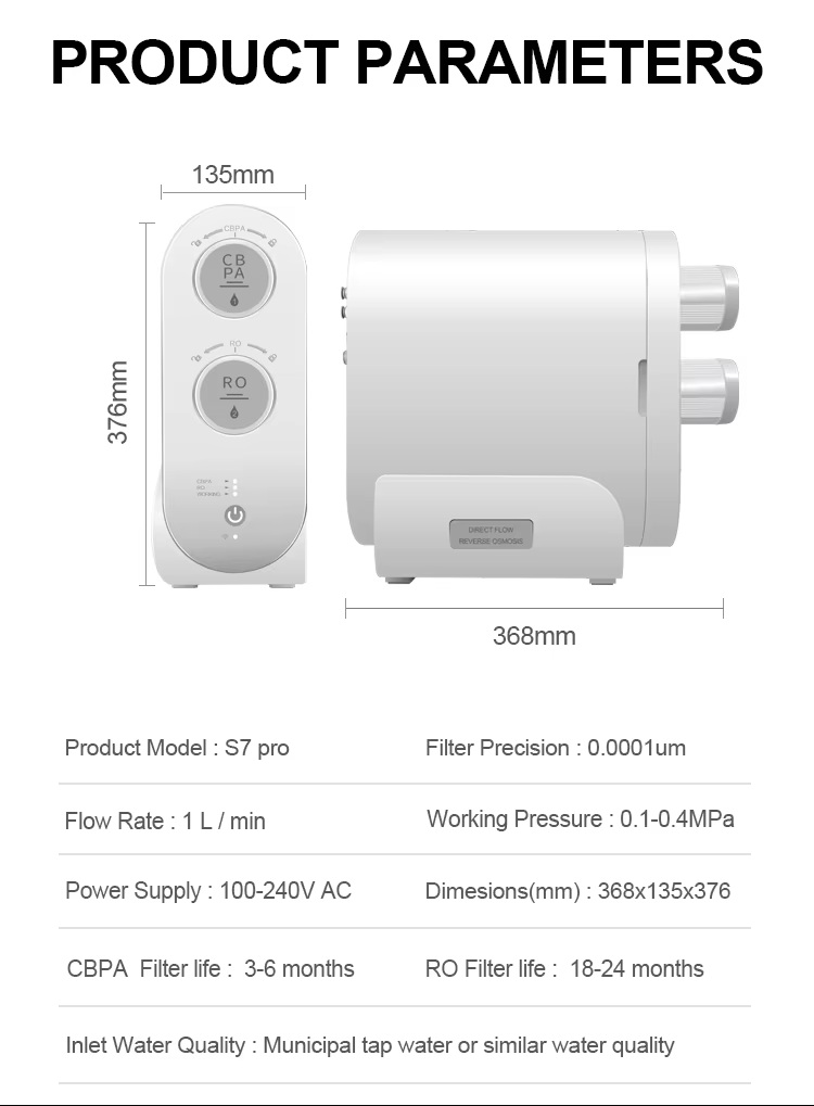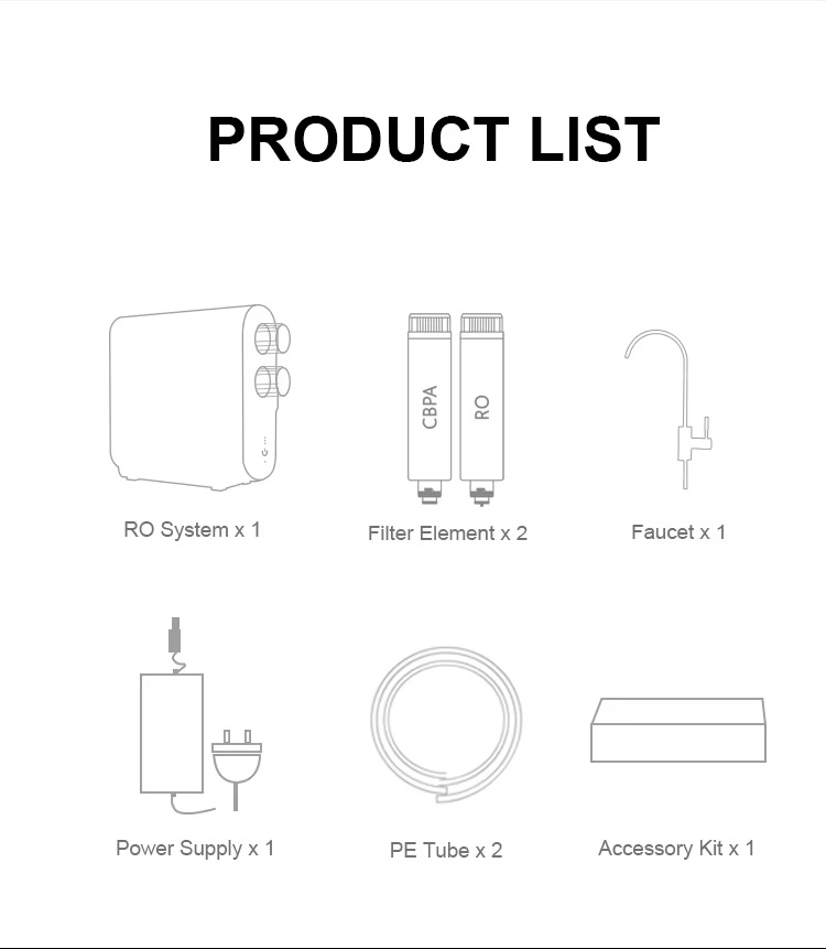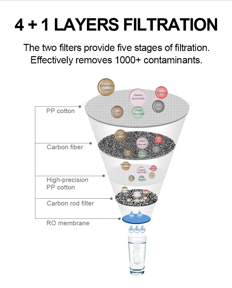 Dieses 5-stufige RO-Umkehrosmose-Wasseraufbereitungssystem liefert 400 GPD und gewährleistet sauberes Trinkwasser mit einem Filterwert von 0,0001 µm. Integriert ist eine TDS-Überwachung. Die Wasserfilteranlage verfügt über eine Selbstreinigungsfunktion, eine Anzeige für die Filterlebensdauer und eine 3-jährige Garantie
